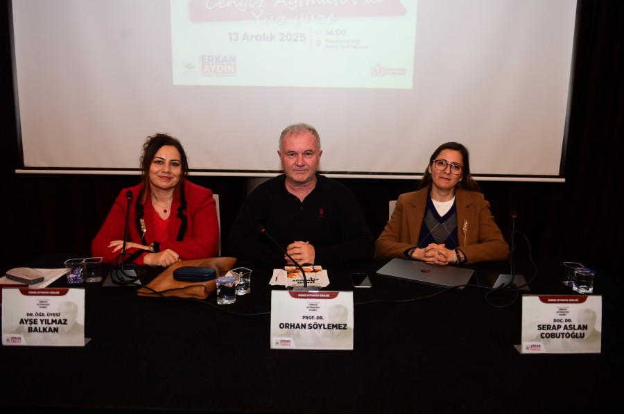 kavramlarını dönüştürerek, sanatta dönüştürücü bir güç olarak kullanarak ütopik etkisini nasıl açığa çıkarttığı üzerinde durduk." derken, Dr. Ayşe Yılmaz Balkan da, Aytmatov'un çocukluğundan, gençliğinden, doğduğu coğrafyanın özelliklerinden, eğitim ve mesleğinden bahsetti.