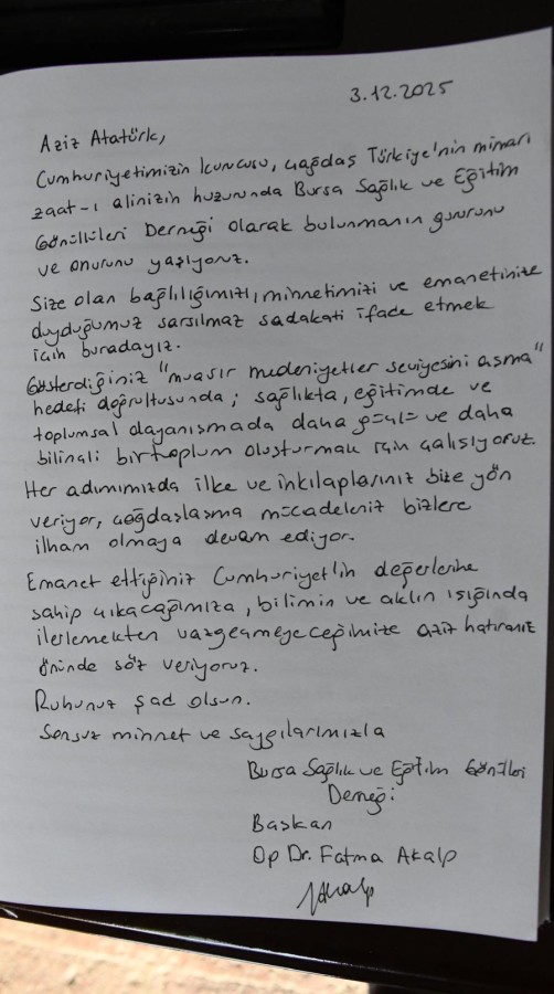Cumhuriyetimizin kurucusu, çağdaş Türkiye'nin mimarı zât-i âlinizin huzurunda Bursa Sağlık Eğitim ve Gönüllüleri Derneği olarak bulunmanın gururunu ve onurunu yaşıyoruz.