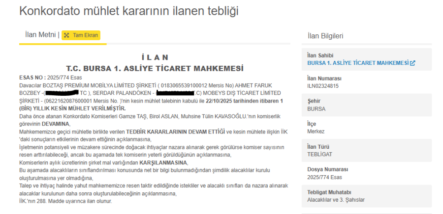 Bursa 1. Asliye Ticaret Mahkemesi, Boztaş Premium Mobilya Ltd. Şti., Ahmet Faruk Bozbey, Serdar Palandöken ve Mobeys Dış Ticaret Ltd. Şti.'nin konkordato talebini kabul ederek, firmalara 22 Ekim 2025 tarihinden itibaren 1 yıl süreyle kesin mühlet verilmesine karar verdi.