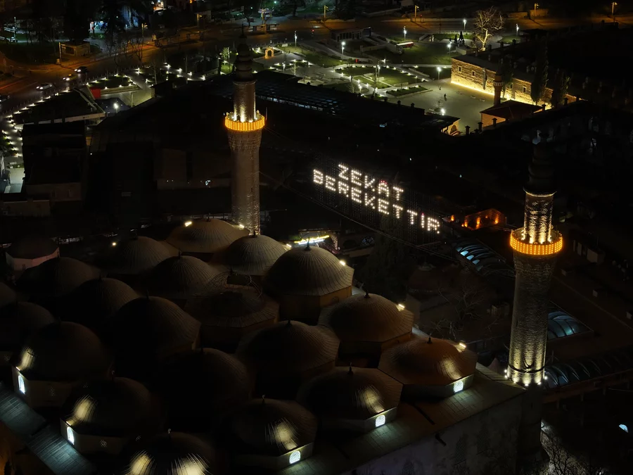 Bursa'da 627 yıllık Ulu Cami'nin 2 minaresi arasına asılan 'Kul hakkından sakın' mahyasının yerine 'Zekat Berekettir' yazısı asıldı. Mahyada alışılagelmişin dışına çıkılarak, ovadan dağa doğru değil de, dağdan ovaya doğru okunacak.