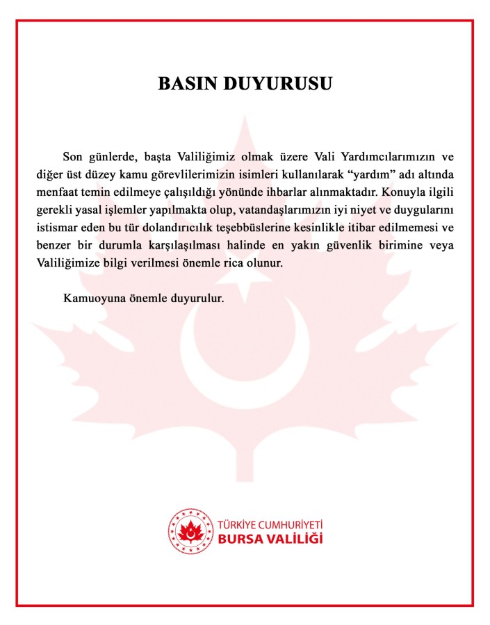"Son günlerde, başta Valiliğimiz olmak üzere Vali Yardımcılarımızın ve diğer üst düzey kamu görevlilerimizin isimleri kullanılarak "yardım" adı altında menfaat temin edilmeye çalışıldığı yönünde ihbarlar alınmaktadır. Konuyla ilgili gerekli yasal işlemler yapılmakta olup, vatandaşlarımızın iyi niyet ve duygularını istismar eden bu tür dolandırıcılık teşebbüslerine kesinlikle itibar edilmemesi ve benzer bir durumla karşılaşılması halinde en yakın güvenlik birimine veya Valiliğimize bilgi verilmesi önemle rica olunur.