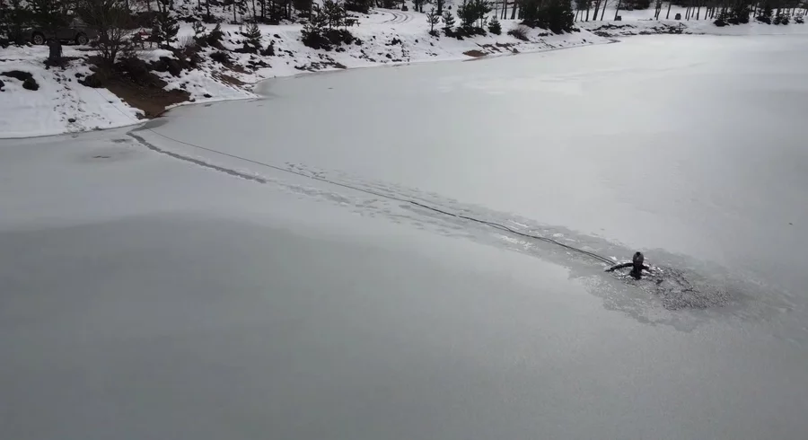 Şentürk, bu yılda önce çökertme oynadığı gölün üzerini kaplayan kalın buz tabakasını kesip açtığı alandan buz gibi suya girdi.