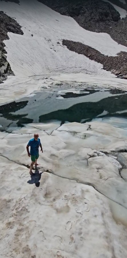 Saklı Göl ve Buzlu Göl'e geldiklerinde gölün bir kısmının hala buzlarla kaplı olduğunu ekip, gerekli önlemler aldıktan sonra buz kaplı gölde hem yürüdü hem de yüzdü.