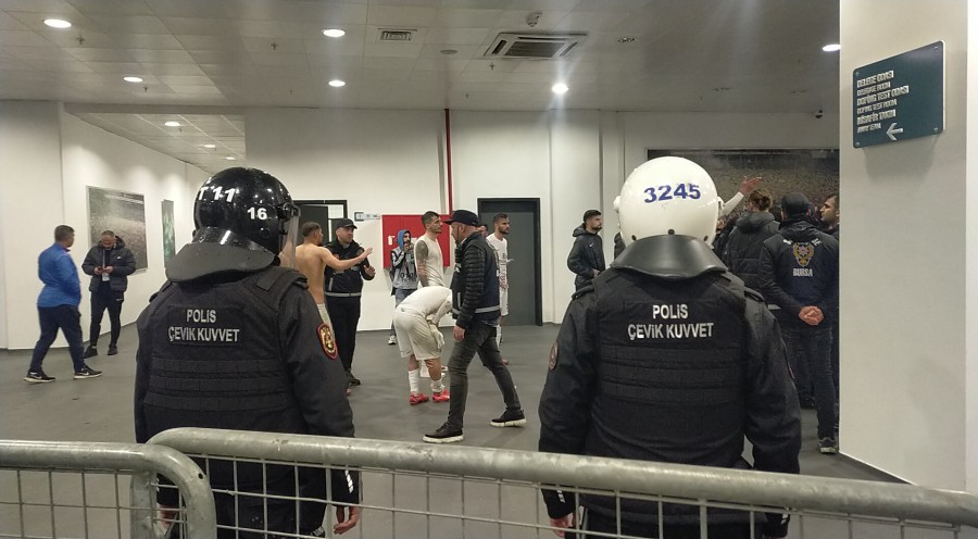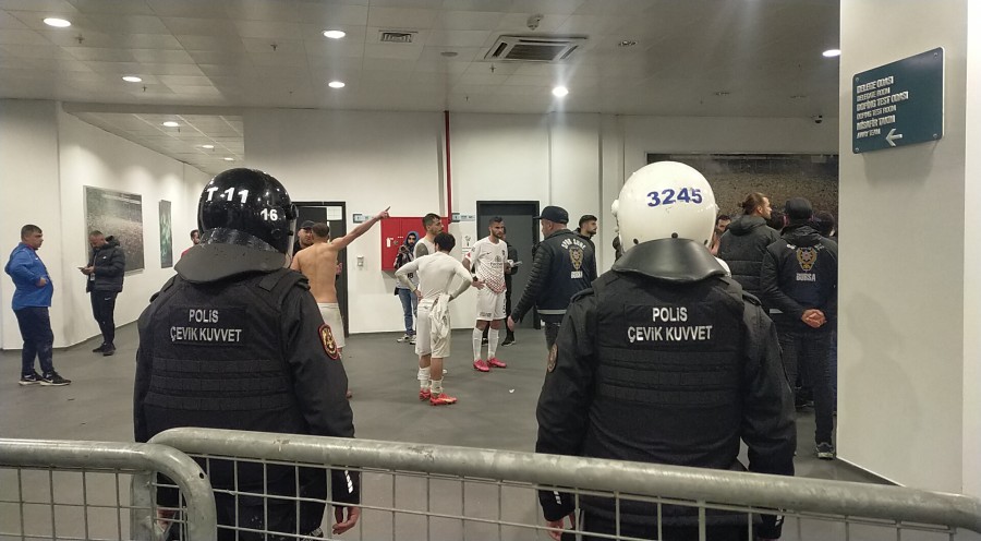 Maç sonu futbolcular soyunma odasına girerken, tansiyon yeniden yükseldi. Amed Sportif Faaliyetler yöneticileri ve futbolcuları ile Bursaspor tribünleri arasında gerginlik yaşandı.