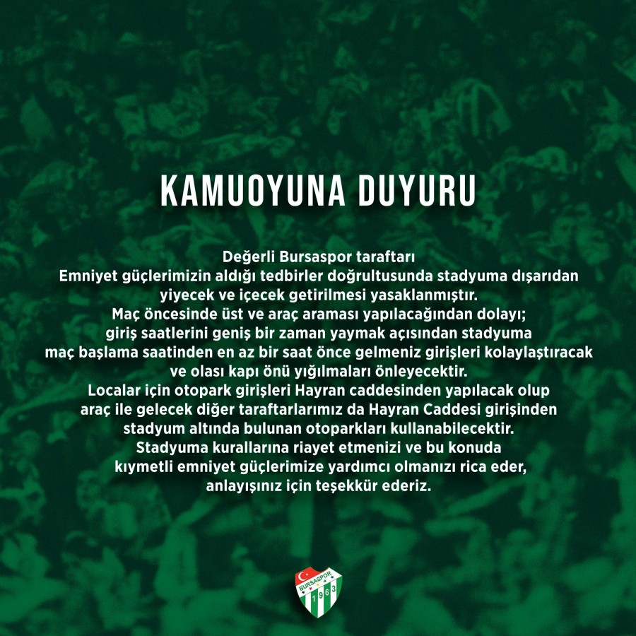 Bursaspor bugün gerçekleşecek Amed Sportif Faaliyetler maçı öncesi sosyal medyadan taraftara uyarıda bulundu.