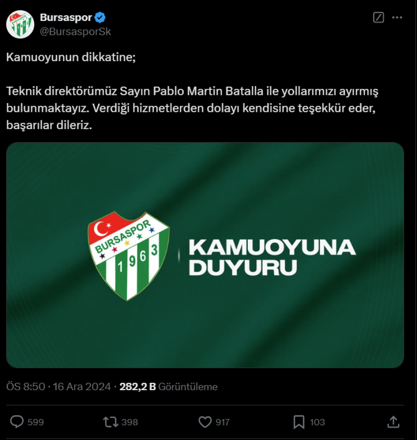 Bursaspor'da Teknik Direktör Pablo Martin Batalla ile yollar ayrıldı.