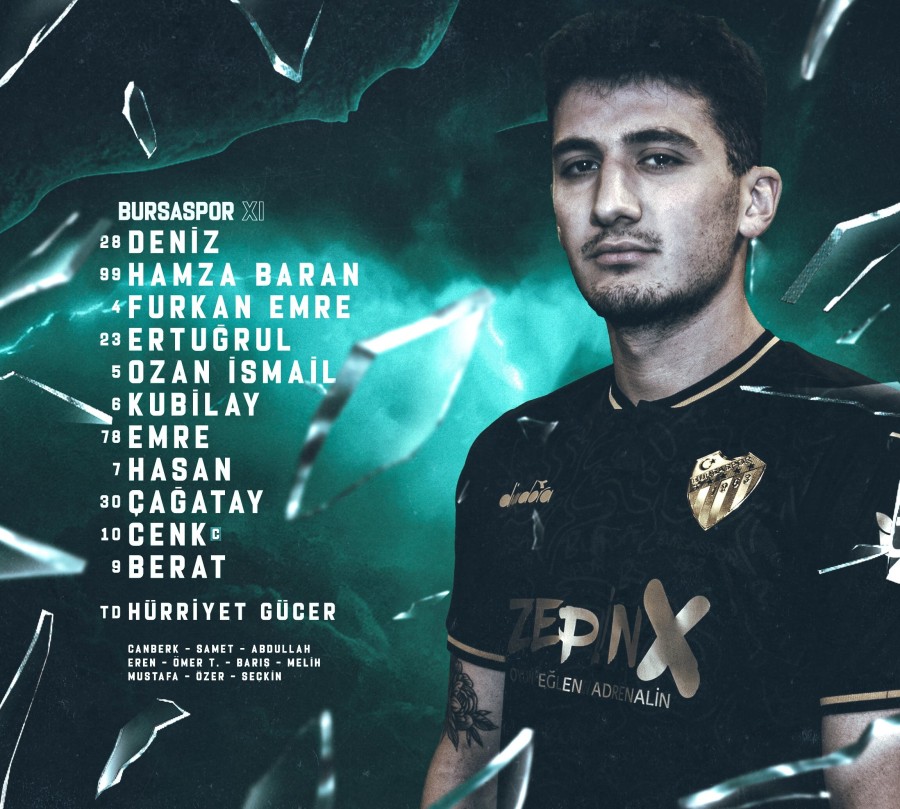 Bursaspor: Deniz Aydın xxx, Ertuğrul Kurtuluş xx, Furkan Emre Ünver xx (Barış Dalkıran dk. 75 x), Hamza Baran Arıkan xx (Eren Tunalı dk. 65 x), Ozan İsmail Koç xx, Kubilay Sönmez xx, Emre Tepegöz xx (Mustafa Genç dk. 65 x), Hasan Ayaroğlu xx, Ömer Turan Görgüç xx (Abdullah Tazgel dk. 70 x), Çağatay Yılmaz xx (Melih Sağlam dk. 76 ?), Berat Altındiş xxx