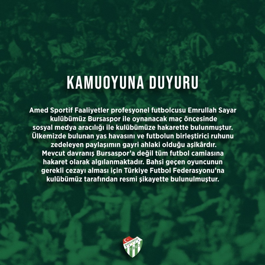 Bursaspor Kulübü, Amed Sportif Faaliyetler futbolcusu Emrullah Sayar'ı, hakaret içerikli paylaşımı sebebiyle Türkiye Futbol Federasyonu'na şikayet ettiğini açıkladı.
