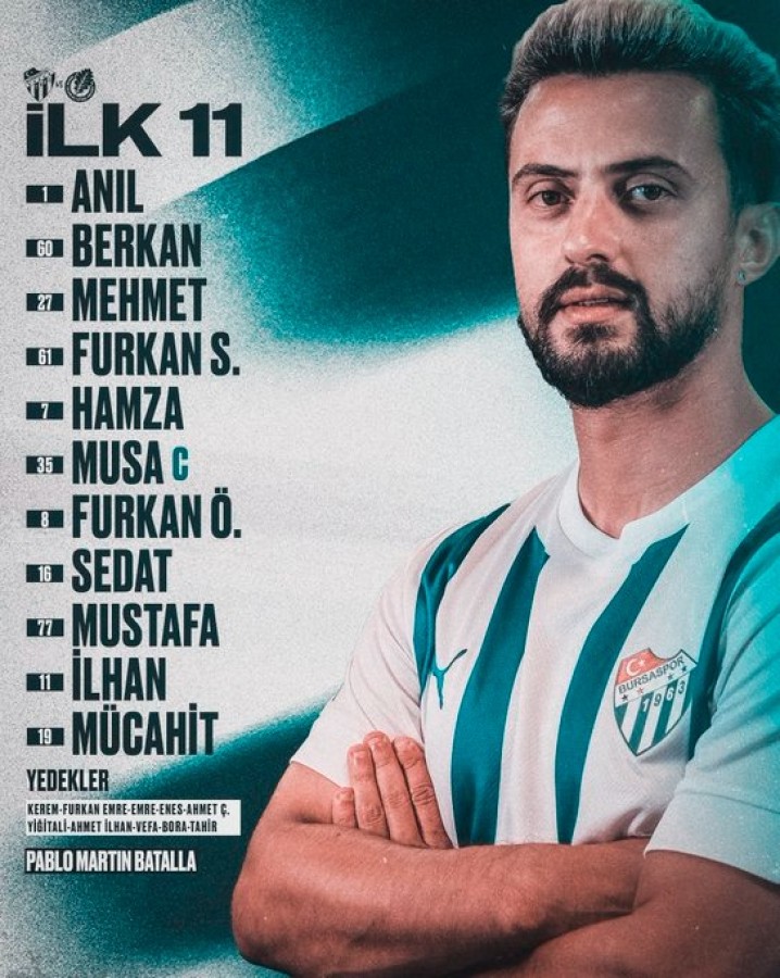 Şampiyon formayla sahada olan Bursaspor'un ilk 11'i şöyle: Anıl, Berkan, Mehmet, Furkan S., Hamza, Musa C., Furkan Ö., Sedat, Mustafa, İlhan, Mücait