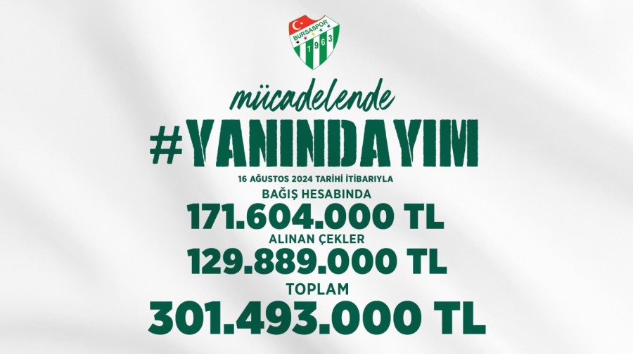 Yeşil-beyazlı kulüp, kampanyaya yapılan bağışların 301 milyon 493 bin TL'ye ulaştığını kamuoyu ile paylaştı. 2009-2010 sezonunda Süper Lig şampiyonu olan ancak sonrasında kötü yönetimlerin başa geçmesi ve beraberinde gelen maddi zorluklar sebebiyle TFF 3. Lig'e kadar düşen Bursaspor, yeniden ayağa kalkması için Türkiye'de eşine zor rastlanır bir kampanyaya imza atıyor. Bursaspor Kulübü'nün bu kampanyası tüm hızıyla da devam ediyor.