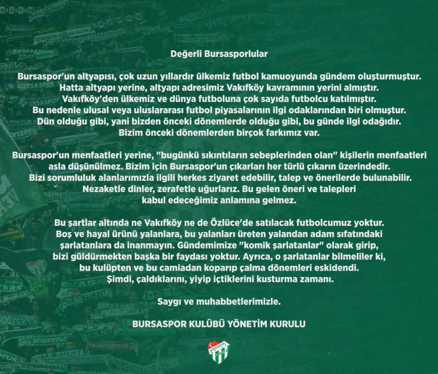 "Bursaspor'un altyapısı, çok uzun yıllardır ülkemiz futbol kamuoyunda gündem oluşturmuştur. Hatta altyapı yerine, altyapı adresimiz Vakıfköy kavramının yerini almıştır. Vakıfköy'den ülkemiz ve dünya futboluna çok sayıda futbolcu katılmıştır. Bu nedenle ulusal veya uluslararası futbol piyasalarının ilgi odaklarından biri olmuştur. Dün olduğu gibi, yani bizden önceki dönemlerde olduğu gibi, bu günde ilgi odağıdır. Bizim önceki dönemlerden birçok farkımız var. Değerli Bursasporlular, Bursaspor'un menfaatleri yerine, 'bugünkü sıkıntıların sebeplerinden olan' kişilerin menfaatleri asla düşünülmez. Bizim için Bursaspor'un çıkarları her türlü çıkarın üzerindedir. Bizi sorumluluk alanlarımızla ilgili herkes ziyaret edebilir, talep ve önerilerde bulunabilir. Nezaketle dinler, zarafetle uğurlarız. Bu gelen öneri ve talepleri kabul edeceğimiz anlamına gelmez. Bu şartlar altında ne Vakıfköy ne de Özlüce'de satılacak futbolcumuz yoktur. Boş ve hayal ürünü yalanlara, bu yalanları üreten yalandan adam sıfatındaki şarlatanlara da inanmayın. Gündemimize 'komik şarlatanlar' olarak girip, bizi güldürmekten başka bir faydası yoktur. Ayrıca, o şarlatanlar bilmeliler ki, bu kulüpten ve bu camiadan koparıp çalma dönemleri eskidendi. Şimdi, çaldıklarını, yiyip içtiklerini kusturma zamanı. Saygı ve muhabbetlerimizle. Bursaspor Kulübü Yönetim Kurulu."