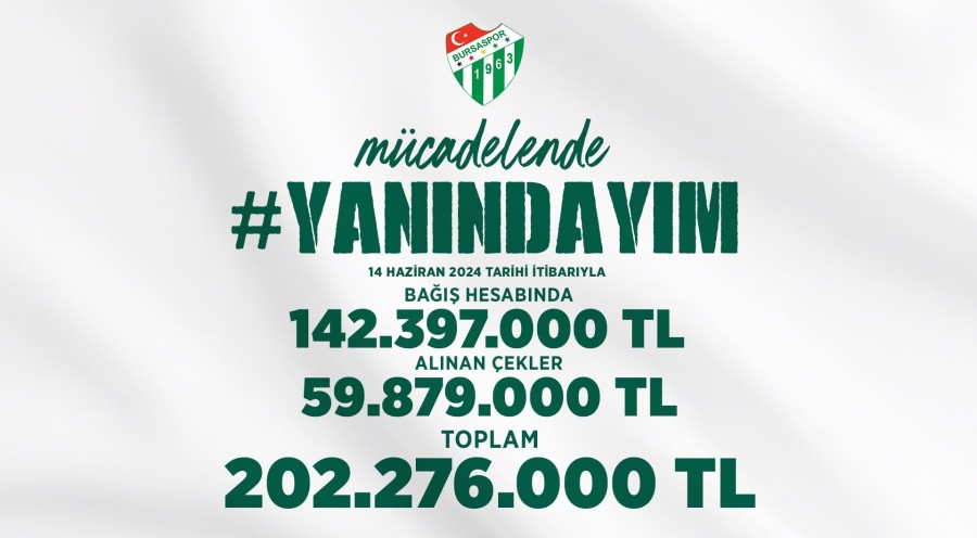Bursaspor Kulübü, bugün 50 milyon TL'ye yakın destek aldığını ve 'Yanındayım' kampanyasının 18 gün sonunda 202 milyon 276 bin TL'ye ulaştığını duyurdu.