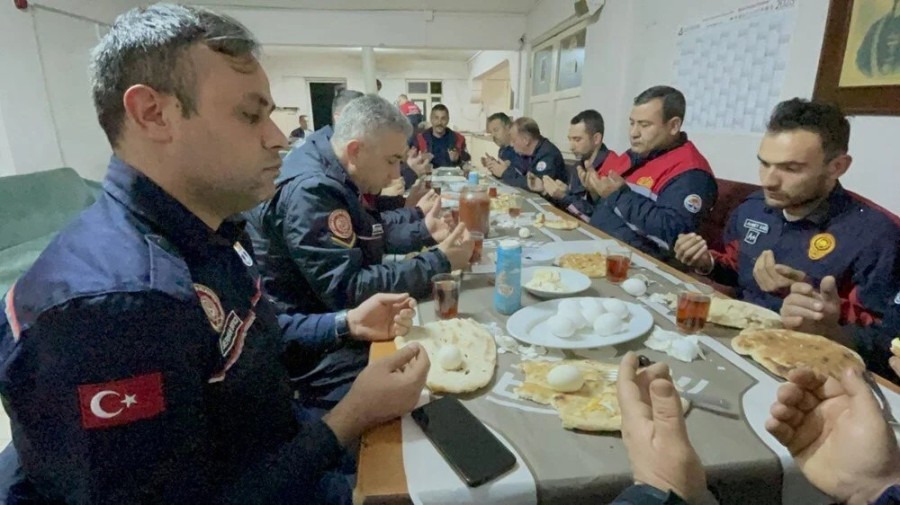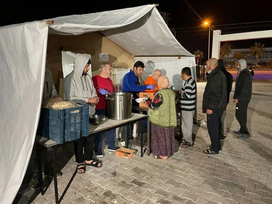 Aşevinde dağıtılan çorba, peynir, zeytin ve balı yiyen depremzedeler, ezan vaktinin gelmesiyle oruca niyetlenerek dua etti.