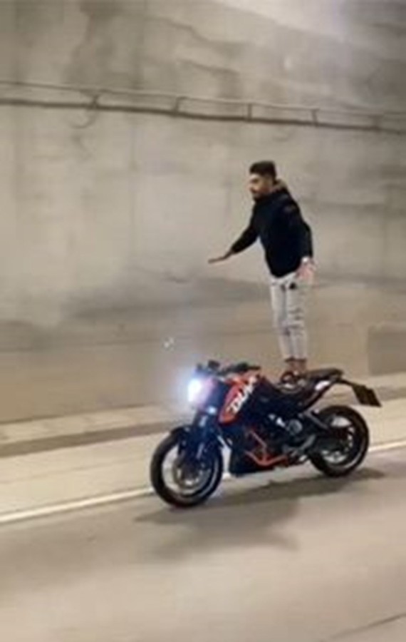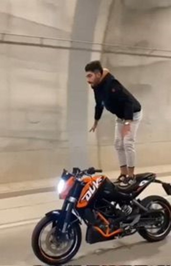 Vatandaşlar tarafından çekilen görüntülere göre, bir motosiklet sürücüsü, seyir halindeki motosikletin selesinde basarak ayağa kalktı.