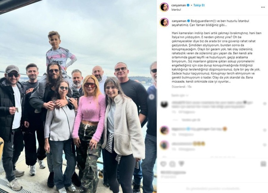 "Bodyguardlarım(!) ve ben huzurlu İstanbul seyahatimiz. Can Yaman bildiğiniz gibi... Hani kameraları indirip beni artık çekmeyi bırakmıştınız, hani ben İtalya'nın yıldızıydım. E nerden çıktınız yine? Oh be çekmeyecekler diye biz de arada bir ona güvenip rahat rahat geziyorduk. Şimdiden söylüyorum, bundan sonra da konuşmayacağım. Olaylı bir gecem yok, tek olay sizlersiniz, rahatsızlık veren de sizlersiniz, şov yapan da...