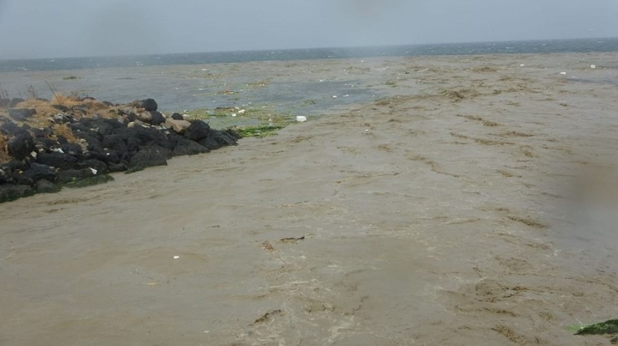 Çınarlıdere Çayı'nın su seviyesi yükselince, kullanılmayan bir balıkçı teknesi battı.