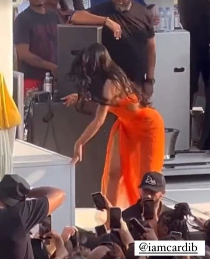 Güvenlik görevlileri olaya müdahale ederken mikrofonsuz kalan Cardi B'nin saçlarını düzeltmesi dikkat çekmişti.