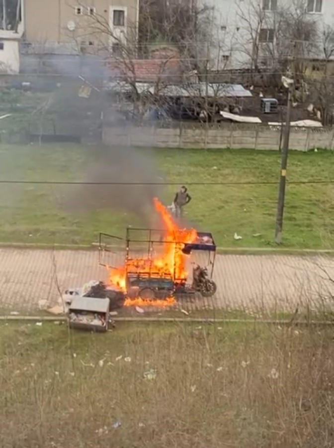 Kocaeli'de bir kağıt toplayıcısı, ekmek teknesi motosikletinin alev alev yanışını çaresiz gözlerle izledi. O anlar cep telefonu kamerasıyla saniye saniye kaydedildi.