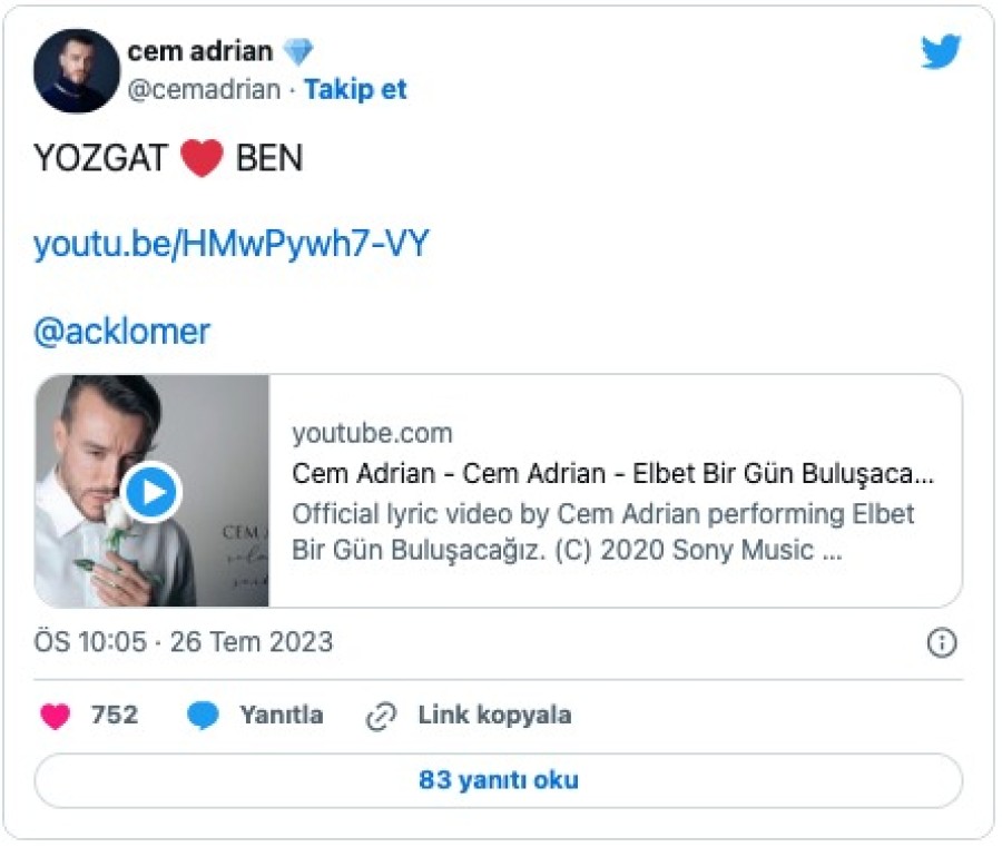 Yasak kararının ardından Adrian kendisinin de seslendirdiği Müren'in "Elbet Bir Gün Buluşacağız" şarkısını paylaşarak, "Yozgat ? Ben" notunu düştü.