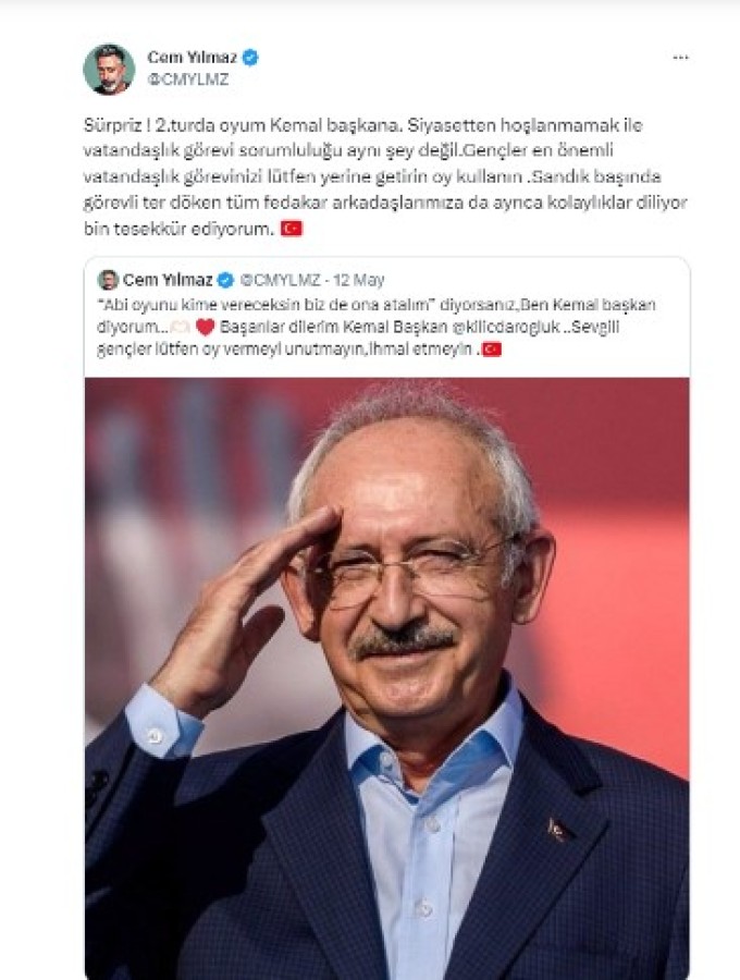 "Sürpriz ! 2.turda oyum Kemal başkana. Siyasetten hoşlanmamak ile vatandaşlık görevi sorumluluğu aynı şey değil. Gençler en önemli vatandaşlık görevinizi lütfen yerine getirin oy kullanın .Sandık başında görevli ter döken tüm fedakar arkadaşlarımıza da ayrıca kolaylıklar diliyor bin teşekkür ediyorum."