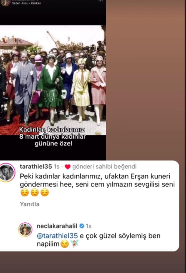 Bir sosyal medya kullanıcısı paylaşımın altına "Peki kadınlar, kadınlarımız ufaktan Erşan Kuneri göndermesi! Seni Cem Yılmaz'ın sevgilisi seni" yorumunu yazdı. Karahalil, takipçisinin yorumuna"E çok güzel söylemiş ben ne yapayım" cevabını verdi.