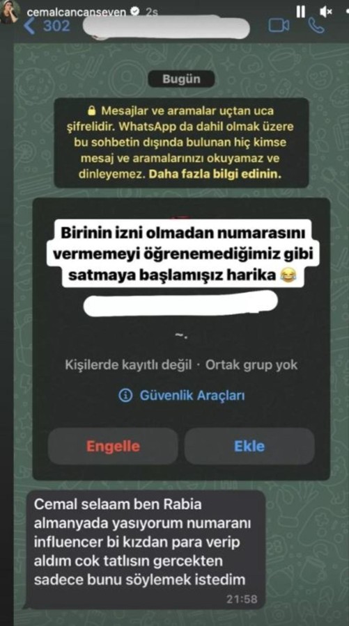 Sosyal medya hesabından bir ekran görüntüsü paylaşan Cemal Can Canseven, telefon numarasının bir influencer tarafından hayranına satıldığını öğrenince şaştı kaldı.