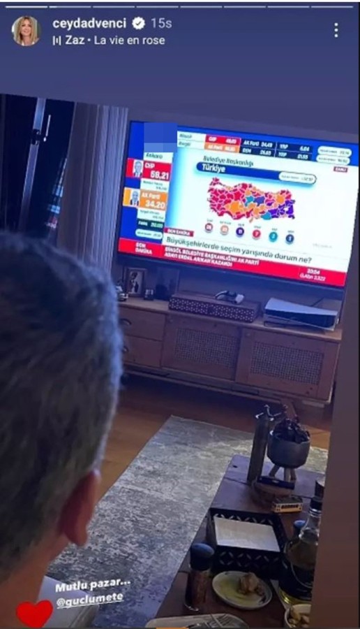 31 Mart Yerel Seçim sonuçlarını sevgilisiyle birlikte takip eden Düvenci, Güçlü Mete'yi paylaşarak "Mutlu pazarlar" notunu düştü ve kalp emojisi de koydu.