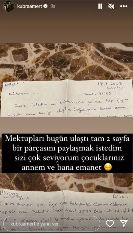 Engin Polat'ın kız kardeşi Kübra Polat, Instagram hesabından Dilan Polat'ın kendilerine gönderdiği mektubun bir kısmını paylaşarak "Mektupları bugün ulaştı tam 2 sayfa, bir parçasını paylaşmak istedim. Sizi çok seviyorum, çocuklarınız annem ve bana emanet" dedi. Dilan Polat'ın 18 Kasım'da yazdığı mektupta ise şu ifadeler yer alıyor: "Çok özledim be Kübra'm. Size gelince hep iyiyim diyorum ama hiç iyi değilim. Boğuluyorum burada. Canım annem sizi öyle çok özledim ki. Canım Kübra'm hepinizi çok seviyorum. Şu an saat 20:30 öyle sıkıldık ki dört duvar arasında Nilgün ile beraber yürüdük oda içerisinde bir ileri bir geri... Bacaklarım ağrıyor. Her gün düşünmekten..."