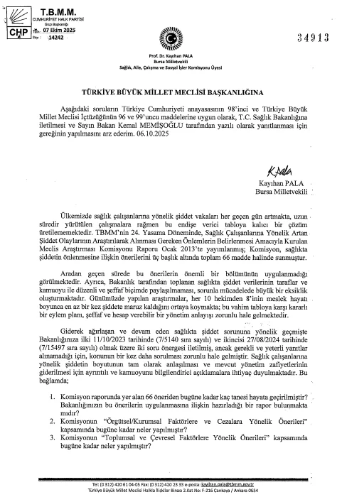 "Sağlık Bakanlığı, soru önergelerimizi yanıtsız bırakarak, sağlık sistemini derinden tehdit eden şiddet sorununun boyutunu ve yönetim zafiyetlerini sağlık çalışanlarından gizlemektedir" diyen Pala, gelinen noktada net bir açıklamanın zorunlu olduğunu vurgulayarak, Bakan Memişoğlu'na yeni bir soru önergesi iletti. Buna karşın Bakan, kendisine 6 Ekim 2025'te iletilen soru önergesine Anayasa'nın 98'inci maddesi uyarınca öngörülen on beş günlük süre dolmasına rağmen yanıt vermedi.
