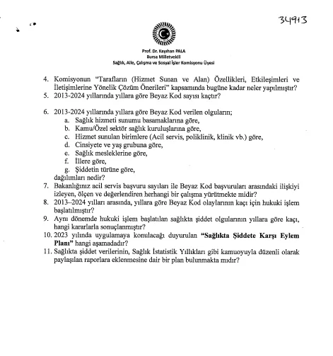 Prof. Dr. Pala, soru önergesinin sonunda 2023'te duyurulan "Sağlıkta Şiddete Karşı Eylem Planı"nın hangi aşamada olduğunu sordu. "Eski Sağlık Bakanı Fahrettin Koca, 2023'te 'Sağlıkta Şiddete Karşı Eylem Planı'nın uygulanacağını açıkladı. O tarihten bu yana kamuoyuna yapılan açıklamalarda da soru önergelerine verilen yanıtlarda da planın takvimi ve hedeflerine dair somut bir bilgi paylaşılmamıştır. Sağlık çalışanlarına şiddetin katalog suçlar arasına alındığı ifade edilse de bu kapsamda kaç yasal işlem yapıldığı açıklanmamaktadır" diyerek Bakanlığı bir kez daha şeffaf ve hesap verebilir olmaya çağırdı.