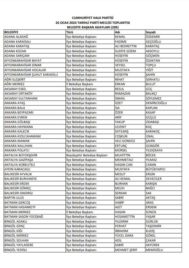 Yerel seçimler için aday çalışmalarını sürdüren CHP PM'de 209 belediye başkan adayı belli oldu.