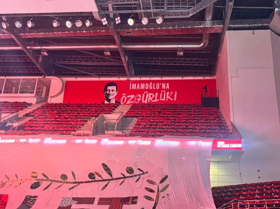 Salonda CHP'nin tutuklu Cumhurbaşkanı Adayı Ekrem İmamoğlu için de "İmamoğlu'na özgürlük" yazılı bir pankart ile Özel ve İmamoğlu'nun fotoğraflarının yer aldığı "Kurtuluş yok tek başına, ya hep beraber ya hiçbirimiz" pankartı asıldı.