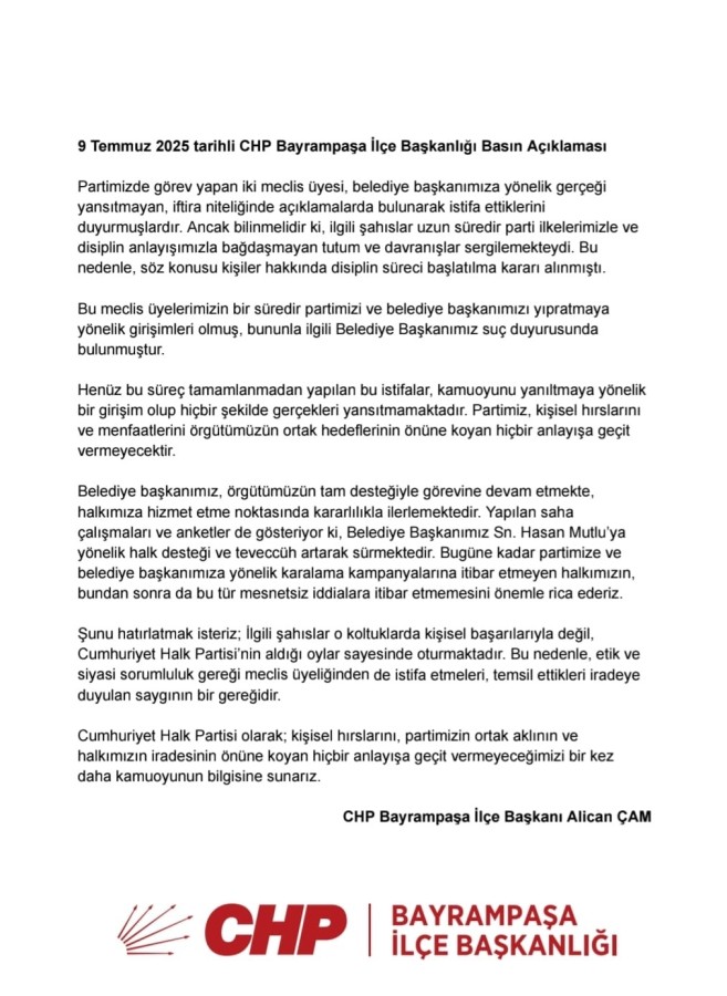 "Partimizde görev yapan iki meclis üyesi, belediye başkanımıza yönelik gerçeği yansıtmayan, iftira niteliğinde açıklamalarda bulunarak istifa ettiklerini duyurmuşlardır. Ancak bilinmelidir ki, ilgili şahıslar uzun süredir parti ilkelerimizle ve disiplin anlayışımızla bağdaşmayan tutumlar ve davranışlar sergilemekteydi. Bu nedenlemeclis üyelerimizin bir süredir partimizi ve belediye başkanımızı yıpratmaya yönelik girişimleri olmuş, bununla ilgili Belediye Başkanımız suç duyurusunda bulunmuştur.