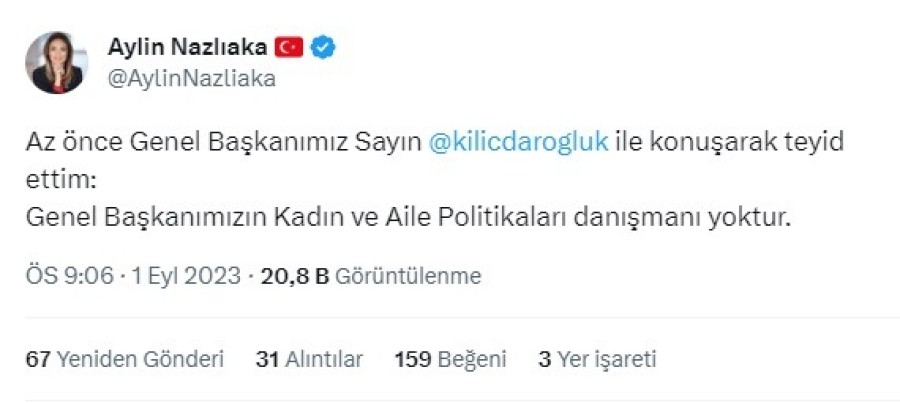 Nazlıaka, sosyal medya platformu X üzerinde yaptığı paylaşımda, "Az önce Genel Başkanımız Sayın Kemal Kılıçdaroğlu ile konuşarak teyit ettim: Genel Başkanımızın Kadın ve Aile Politikaları danışmanı yoktur" ifadelerini kullandı.
