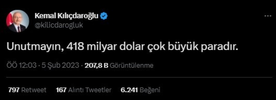 Kılıçdaroğlu, sosyal medya hesabından, "Unutmayın, 418 milyar dolar çok büyük paradır" paylaşımında bulundu.
