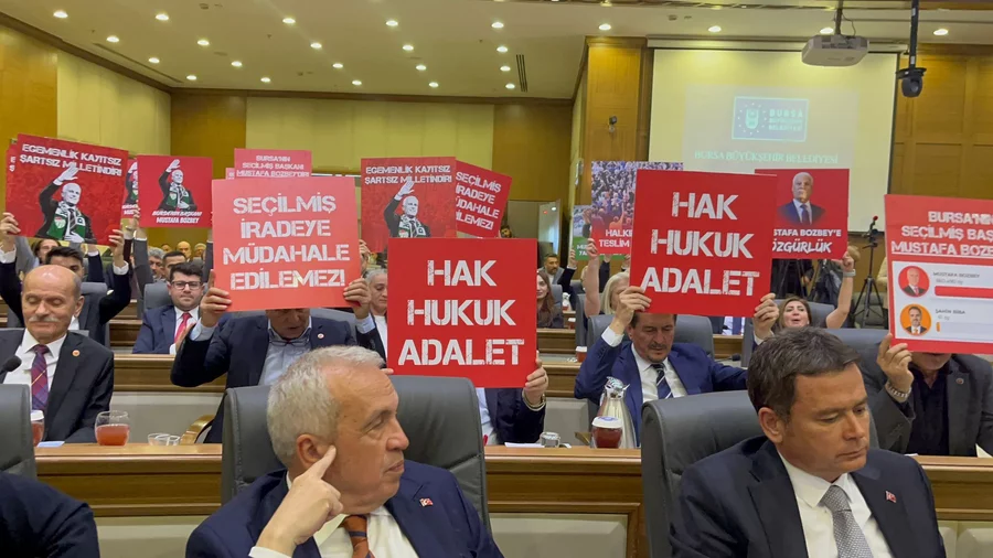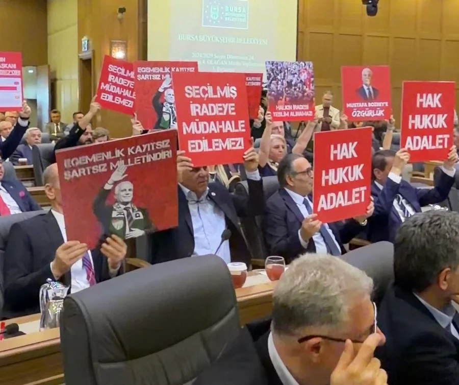 CHP'li Bursa Büyükşehir Belediye Başkanı Mustafa Bozbey'in tutuklanıp görevden uzaklaştırılmasının ardından Başkan Vekili seçilen AK Parti'li Şahin Biba'nın başkanlığında ilk kez toplanan Büyükşehir Belediye Meclisi'nde CHP'li meclis üyeleri Başkan Bozbey'in tutuklanmasını protesto etti. CHP Grup Sözcüsü Avukat Yücel Akbulut, "Yüreğiniz yetiyorsa gidin sandığa! Burada zedelenen yalnızca bir makam değil, doğrudan demokrasinin kendisidir! Mustafa Bozbey yalnız değildir" dedi.