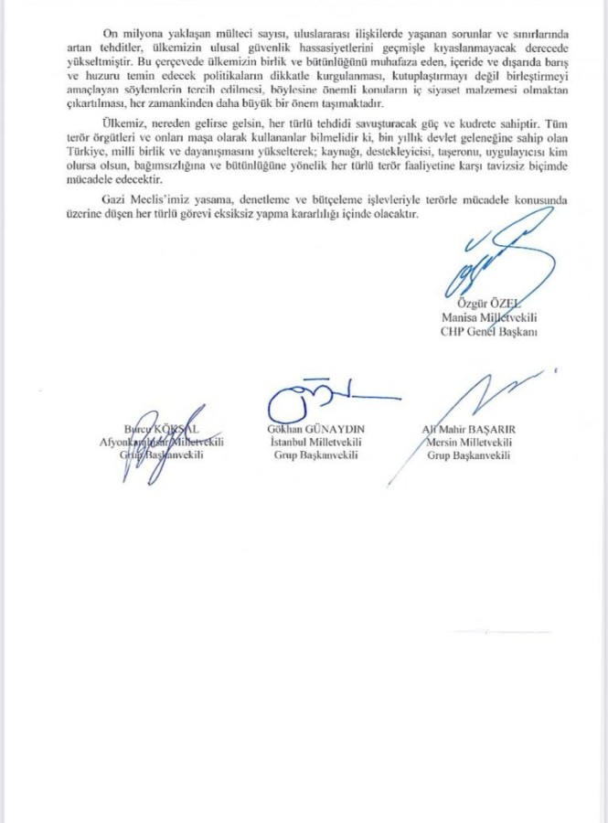 Cumhuriyet Halk Partisi, "Milli güvenliğimiz iç siyaset malzemesi yapılmamalıdır..." başlıklı kendi terör bildirisini paylaştı. CHP lideri Özgür Özel, sosyal medya hesabından "Bugün grup toplantımızdaki çağrımıza uygun olarak Meclisteki hiçbir muhalefet partisinin Cumhur İttifakı'nın dayattığı bildiriye imza atmaması memnuniyet vericidir" notuyla CHP'nin terör saldırıları bildirisini paylaştı.
