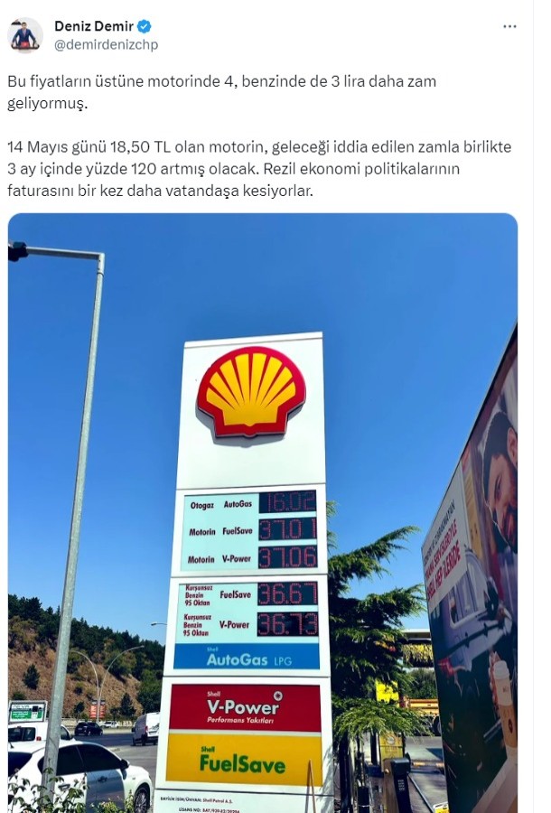 CHP PM üyesi Deniz Demir, güncel akaryakıt fiyatlarını paylaştığı tweet'inde "Bu fiyatların üstüne motorinde 4, benzinde de 3 lira daha zam geliyormuş" ifadelerini kullandı.