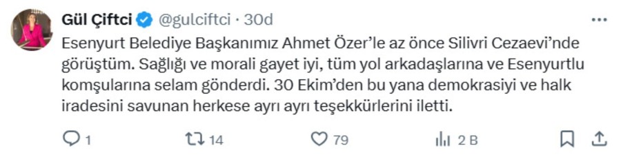 "Esenyurt Belediye Başkanımız Ahmet Özer ile az önce Silivri Cezaevi'nde görüştüm. Sağlığı ve morali gayet iyi, tüm yol arkadaşlarına ve Esenyurtlu komşularına selam gönderdi. 30 Ekim'den bu yana demokrasiyi ve halk iradesini savunan herkese ayrı ayrı teşekkürlerini iletti."