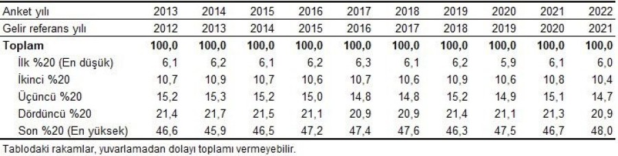 4- 2018'den bugüne başta orta sınıf olmak üzere çalışan kesim fakirleşti. Servet transferi hızlandı. 2022'de en yüksek gelire sahip %20'lik nüfus, toplam milli gelirin yüzde 48'ini aldı. Bu tabloda gelir adaletsizliğini net bir şekilde görebilirsiniz.