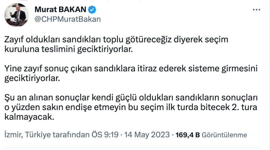 CHP'li Murat Bakan Twitter hesabından yaptığı paylaşımda, "Zayıf oldukları sandıkları toplu götüreceğiz diyerek seçim kuruluna teslimini geciktiriyorlar. Yine zayıf sonuç çıkan sandıklara itiraz ederek sisteme girmesini geciktiriyorlar. Şu an alınan sonuçlar kendi güçlü oldukları sandıkların sonuçları o yüzden sakın endişe etmeyin bu seçim ilk turda bitecek 2. tura kalmayacak" ifadelerine yer verdi.