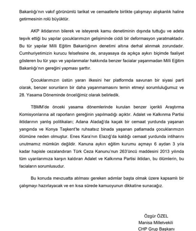 CHP Grup Başkanı Özgür Özel, yaptığı yazılı açıklamada, "Yavrumuzun eğitim gördüğü belirtilen bu kurumun derhal kapatılması, ismi geçen vakfa ait benzer yerlerin de bir an önce denetim altına alınması gerekmektedir" ifadelerini kullandı. Özel, bu tür yapıların Milli Eğitim Bakanlığı'nın denetimi altına alınmak zorunda olduğunu aktardı.