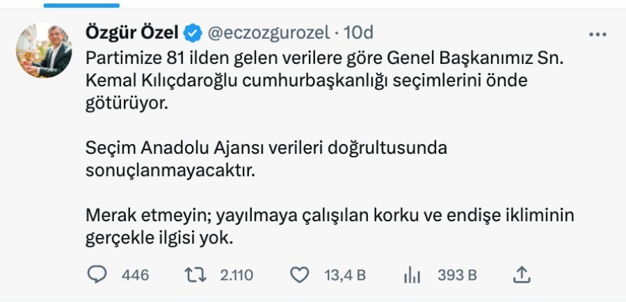 CHP'li Özgür Özel Twitter hesabından yaptığı paylaşımda, "Partimize 81 ilden gelen verilere göre Genel Başkanımız Sn. Kemal Kılıçdaroğlu cumhurbaşkanlığı seçimlerini önde götürüyor. Seçim Anadolu Ajansı verileri doğrultusunda sonuçlanmayacaktır. Merak etmeyin; yayılmaya çalışılan korku ve endişe ikliminin gerçekle ilgisi yok" ifadelerine yer verdi.