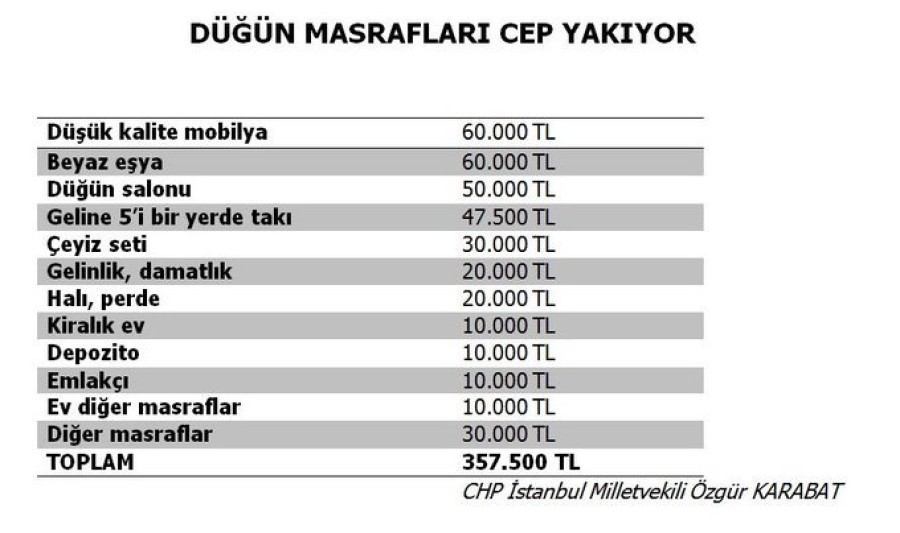 4) Emekli olan bir işçi çocuğunu evlendirmek isterse, aldığı tazminat düğün masraflarını bile karşılayamıyor. Aşağıdaki düğün listesi en uygun şartlarda hazırlandı ama yine de 25 yıllık emeğin karşılığında alınan 335 bin TL tazminat yetmiyor.