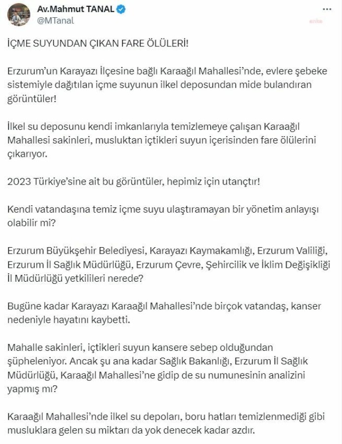 CHP Şanlıurfa Milletvekili Mahmut Tanal, Erzurum'un Karayazı İlçesine bağlı Karaağıl Mahallesi'ndeki içme suyu deposundan fare ölülerinin çıktığı görüntüleri paylaşarak, "Erzurum'un Karayazı İlçesine bağlı Karaağıl Mahallesi'nde, evlere şebeke sistemiyle dağıtılan içme suyunun ilkel deposundan mide bulandıran görüntüler. İlkel su deposunu kendi imkanlarıyla temizlemeye çalışan Karaağıl Mahallesi sakinleri, musluktan içtikleri suyun içerisinden fare ölülerini çıkarıyor. 2023 Türkiye'sine ait bu görüntüler, hepimiz için utançtır!" ifadelerini kullandı.