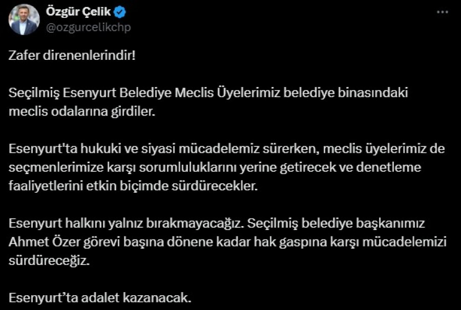 Esenyurt halkını yalnız bırakmayacağız. Seçilmiş belediye başkanımız Ahmet Özer görevi başına dönene kadar hak gaspına karşı mücadelemizi sürdüreceğiz. Esenyurt'ta adalet kazanacak."