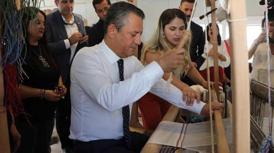Dokuma tezgahının başına geçen Özgür Özel, kadınlarla birlikte kilim dokudu.