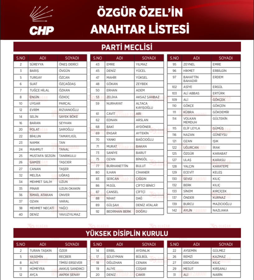 Hem Parti Meclisi (PM) hem de Yüksek Disiplin Kurulu üyelerinin belirleneceği final gününde, Özgür Özel'in anahtar listesinde şu isimler yer aldı: