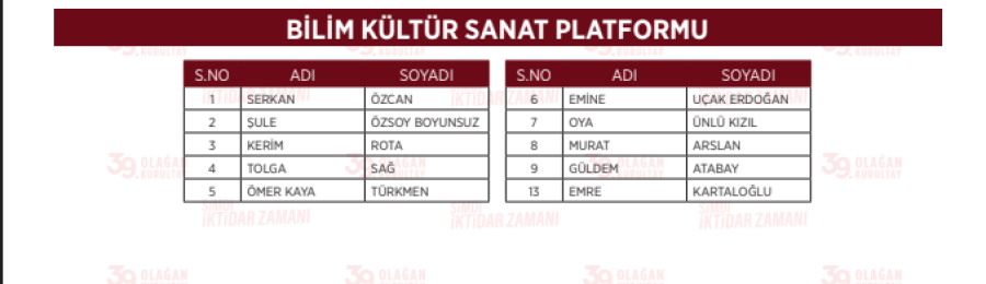 Bilim Kültür Sanat Platformu için ise anahtar listede; Serkan Özcan, Şule Özsoy Boyunsuz, Kerim Rota, Tolga Sağ, Ömer Kaya Türkmen, Emine Uçak Erdoğan, Oya Ünlü Kızıl, Murat Arslan, Güldem Atabay ve Emre Kartaloğlu yer aldı.