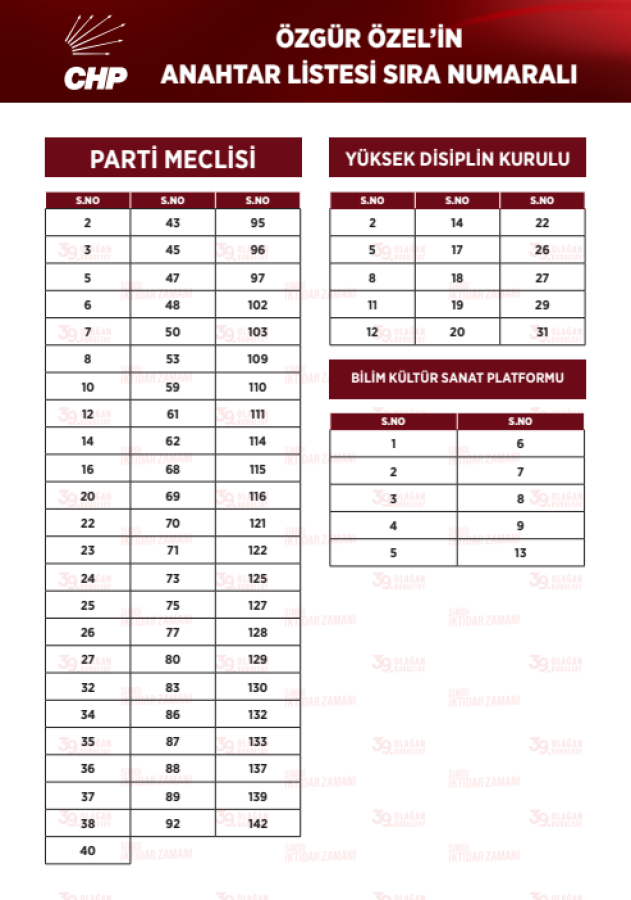 CHP'nin 39. Olağan Kurultayı'nda 145 kişi Parti Meclisi için aday oldu. CHP lideri Özgür Özel'in anahtar listesinde mevcut yönetimdeki 49 isimin korunduğu ve 31 yeni isim eklendiği öğrenildi. Listede Ozan Bingöl, Güldem Atabay, Şule Özsoy Boyunsuz ve İlhan Cihaner gibi isimler olduğu belirtildi.